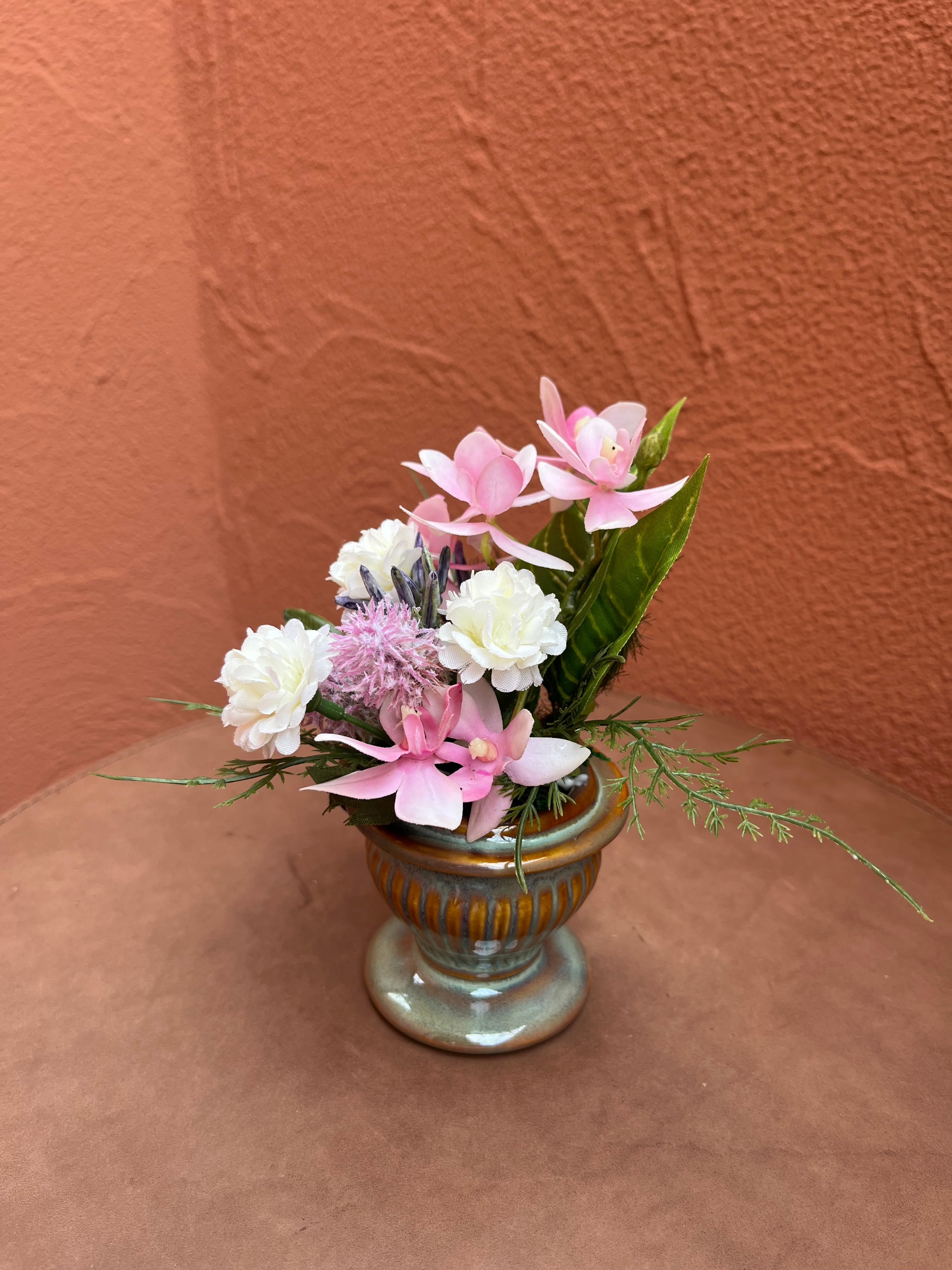 お供え花に人気のファレノシプス(蘭)を小さな器にアレンジしました。